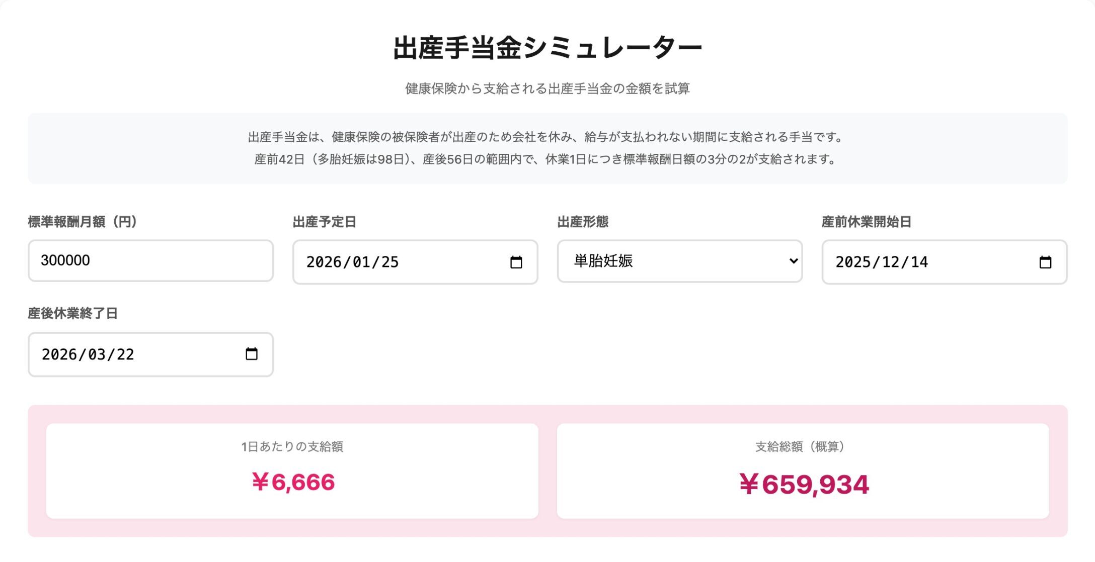 このシミュレーターを使えば、自分がいくらもらえるのかすぐに分かります。標準報酬月額と出産予定日を入力するだけで、支給総額が自動計算されます。